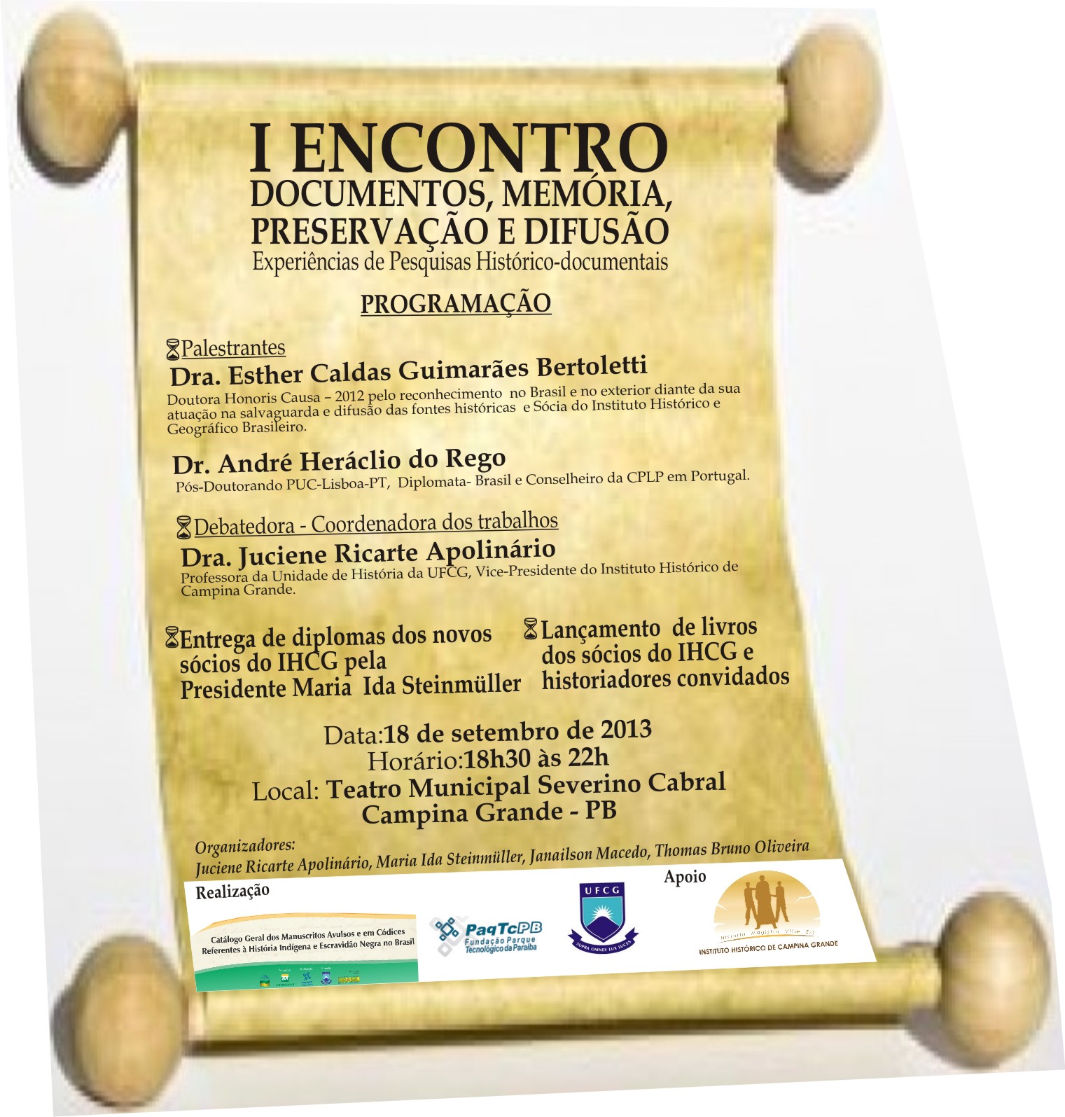 Vão ser lançados no I Encontro de Documento, Memória, Preservação e Difusão, livros de sócios do Instituto Histórico de Campina Grande Casa Elpídio de Almeida, IHCG, e obras de historiadores convidados.